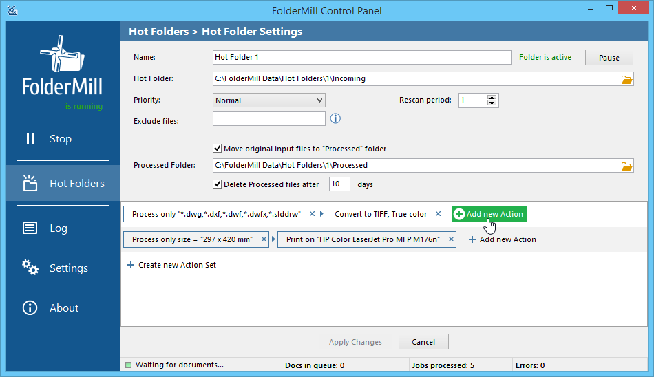 FolderMill has filters by filename, page size, text and others which let the program process and skip specific files. This way, you can assign several rules to Hot Folders, and the incoming files will be printed or converted precisely the way you want it. For example, you can make A0-A2 drawings go to a plotter, and A3/A4 go to a printer. It makes file processing very flexible – the number of possible variations is endless.