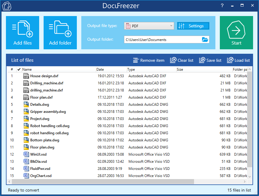 DocuFreezer is a simple and reliable PDF converter for Windows. It lets you convert many files in batches. Converts various documents including DWG and DXF files into images (TIFF, JPEG, PNG), TXT or PDF format, keeping the original structure, layout and text of input files.