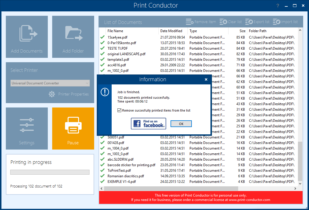 Print Conductor can print any type of printable files (if you know which it can’t - let us know!). Just add documents into the list and click ‘Start printing’. If you need to print the same files over and over again - just export the documents’ list and use it later again. Print Conductor makes your work effective and simple.
